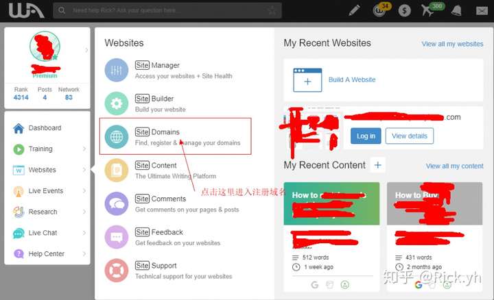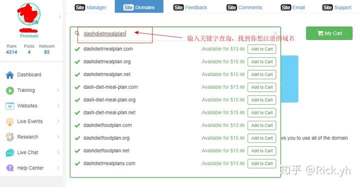- 输入你要注册域名的关键字查询即可,具体步骤如下:在会员中心点击左侧:Websites -> Site Domains 进入下图(WA域名注册界面)所示界面,然后按步骤操作即可。