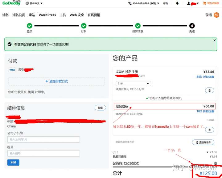 - 通过购物车去付款,注意有很多附加服务,不要勾上,一勾上就是钱。